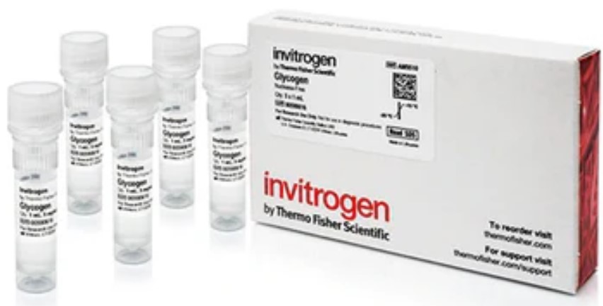 Los coprecipitantes son sustancias inertes que se utilizan para ayudar a la recuperación de los ácidos nucleicos durante precipitaciones de alcohol. Si bien pueden utilizarse para precipitar grandes cantidades de ácidos nucleicos, resultan esenciales para la recuperación cuantitativa de pequeñas cantidades de ácidos nucleicos en soluciones diluidas. A menudo, se prefiere la utilización de estas moléculas simplemente por la visualización del precipitado sedimentado tras la centrifugación. Cuando se usa con una concentración final de 50–150 µg/ml, el glucógeno se coprecipita con ácidos nucleicos en presencia 0,5 M de acetato de amonio e isopropanol o etanol. Se suministra con una concentración de 5 mg/ml en agua destilada tratada con dietil pirocarbonato. El glucógeno no interferirá con lecturas 260/280. El producto de glucógeno se aísla a partir del mejillón, una fuente biológica, como sucede con la mayoría de las demás preparaciones de este coprecipitante. El glucógeno se trata con proteinasa K y SDS para eliminar cualquier nucleasa contaminante y, a continuación, se aplica una extracción de fenol/cloroformo, se precipita con etanol y se resuspende en agua libre de nucleasas. El glucógeno incluye una garantía de ausencia de ARNasa y ADNasa.