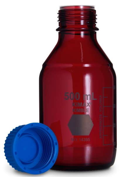 Frasco graduado de laboratorio para cultivo en vidrio borosilicato con acabado RAY-SORB, protege el contenido de los rayos UV y es recomendado en productos sensibles a la luz. Utilizado para el uso general de laboratorio, para mezclar, almacenar, incubar o transportar medios de cultivo, productos químicos o solventes, entre otras aplicaciones.