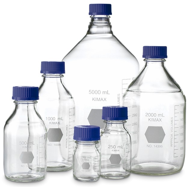 Frasco graduado de laboratorio para cultivo en vidrio borosilicato claro, ideal para el uso general de laboratorio, para mezclar, almacenar, incubar o transportar medios de cultivo, productos químicos o solventes, entre otras aplicaciones.