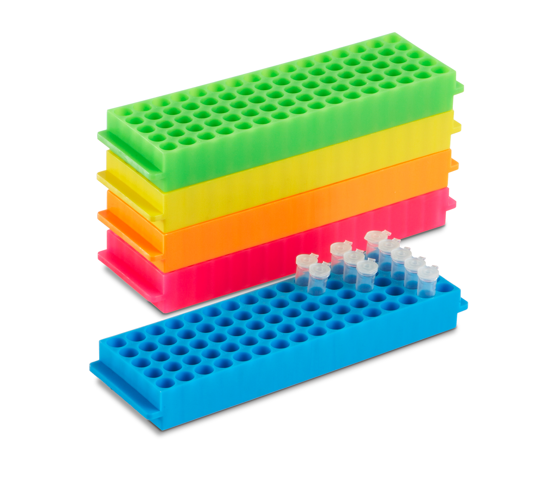 Gradilla para microtubos (80 Lugares, Colores Surtidos) Fabricada en polipropileno para 80 lugares, en forma de plato, compacta, con arreglo de 5×16, con asas en los extremos para transferir tubos, con identificación numérica y es autoclavable. Catálogo Color Lugares Tubos Diámetro de pozo