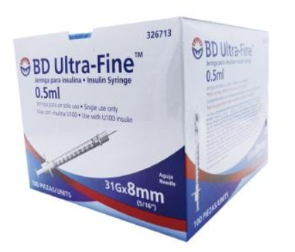 Jeringas BD Ultra-Fine de 0.5 ML con aguja de 8 MM de largo y 31 gauge de grosor. Esta aguja es 37% más corta que la aguja de 13 MM.