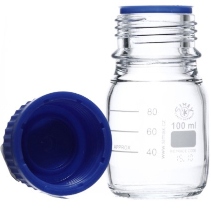 FRASCO GRADUADO DE 100ML CON TAPA DE ROSCA. KAVALIER JC.ELSOL09191 Frasco reactivo de 100mL. Graduación y área para identificación en color blanco. Tapón roscado GL…